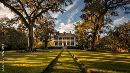 © Iswanto, Obraz premium A stately Southern mansion framed by majestic trees with hanging moss.