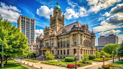 © Adisorn, Naklejka premium A stately stone courthouse building with Romanesque Revival architecture stands proudly in the heart of a bustling Illinois city, surrounded by lush greenery.