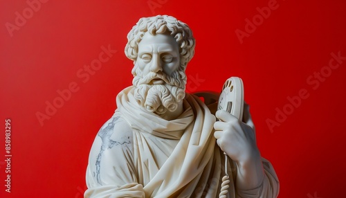 © VISUAL BACKGROUND, Fototapeta premium A statue of a man holding a red phone.