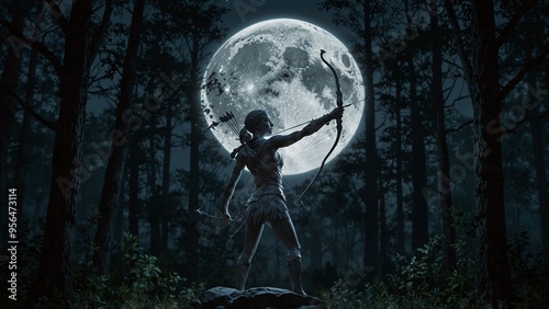 Naklejka premium A statue of Artemis standing in a moonlit forest on a full moon night, holding a silver bow and arrow, with moonlight filtering through the treetops as the backdrop.