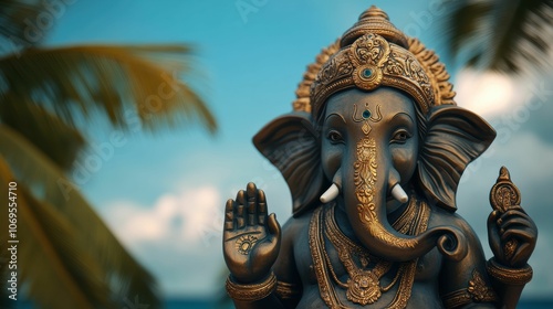 © Shisanupong, Fototapeta premium A statue of Ganesha with a gold nose and a gold ear