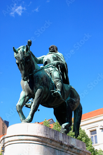 © Miroslav110, Fototapeta premium A statue of Janos Hunyadi on Szechenyi Square in Pecs, Hungary