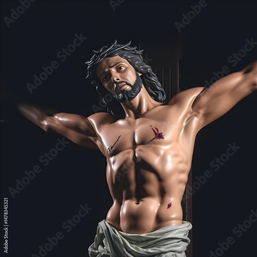 © Waqas, Obraz premium A statue of Jesus Christ on a wooden cross, depicted in a dramatic, dimly lit scene. The statue portrays a male figure, appearing to be in his late twenties, of light complexion. He is wearing a cro