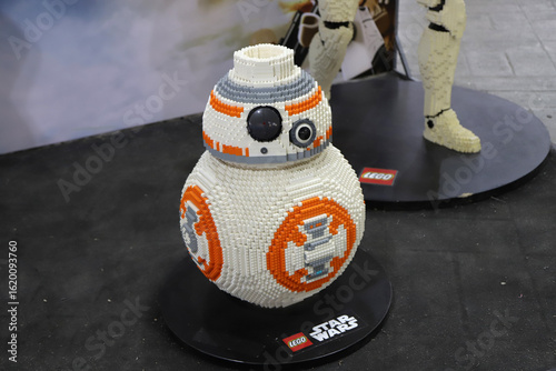 © Acento Creativo, Fototapeta premium A statue of the BB-8 robot from the Star Wars films created with Lego blocks and displayed at an event