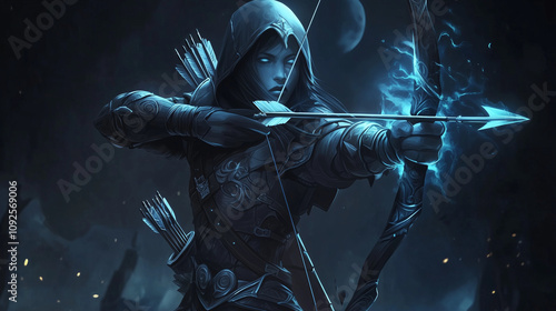 Naklejka premium A stealthy night elf archer with dark, hooded armor, dual shadowy daggers, and a glowing bow strung with a thread of moonlight, illustration, semi realistic drawing