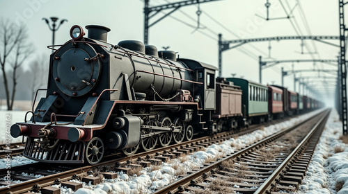 Naklejka premium A steam locomotive travels through a snowy landscape on a railway line during winter, creating a nostalgic atmosphere