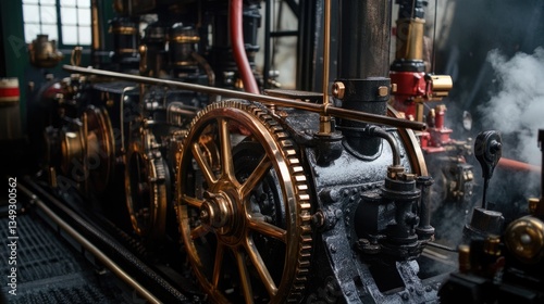 © Boonnam Burart, Fototapeta premium A steam-powered engine with interconnected brass gears turning in perfect synchronization