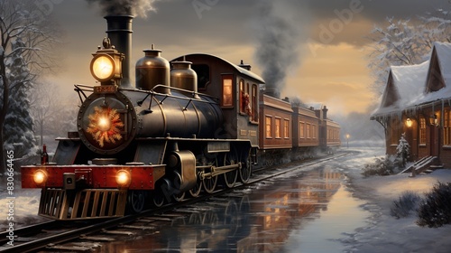 © FantasyDreamArt, Obraz premium A Steam Train Chugging Through a Snow Covered Forest