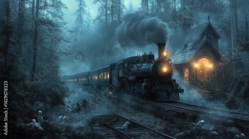© Mnur, Naklejka premium A steam train traverses a misty, dark forest at night.