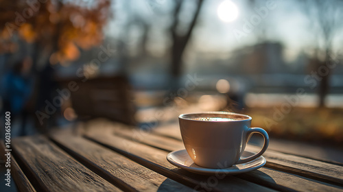 © 阿咩hu, Obraz premium A steaming coffee cup on a table, peaceful morning in the park