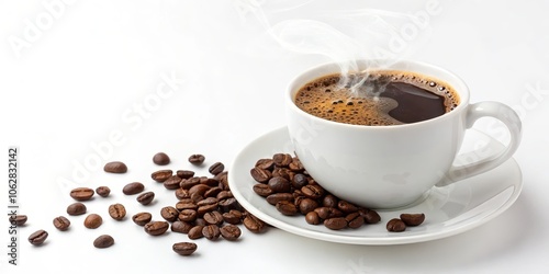 © Theerawat, Fototapeta premium A steaming cup of coffee on a white saucer with scattered coffee beans around it.