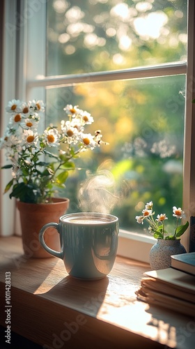 Fototapeta premium A steaming cup of coffee on a windowsill; surrounded by daisies and sunlight...