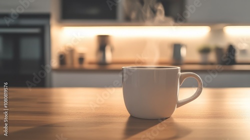 © San, Obraz premium A steaming cup of coffee on a wooden table in a modern kitchen