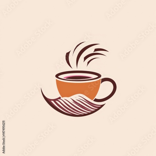 © renny, Obraz premium A steaming cup of coffee sits on a stylized wave, evoking warmth and comfort in a serene setting