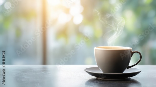 Obraz premium A steaming cup of coffee sits on a table with a blurred, sunlit window view...