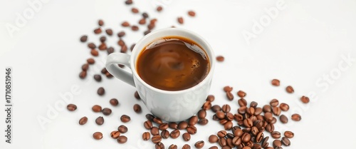 Fototapeta premium A steaming cup of delicious beverage beside scattered coffee beans on a pristine white background, aroma, spill