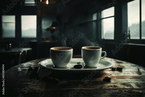 © Omar, Obraz premium A steaming cup of espresso macchiato