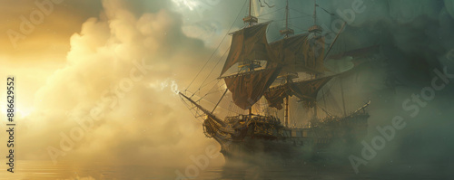 Fototapeta premium A steampunk pirate ship with brass cannons, mechanical sails, and a crew of pirates in Victorian attire. The ship is sailing on a misty sea at sunrise.