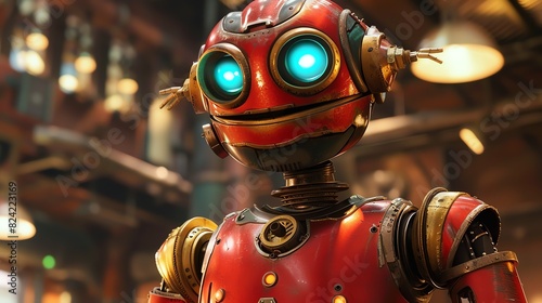 © Galib, Fototapeta premium A steampunk robot with a red and gold body and blue eyes is standing in a dark room. The robot is looking at the camera with a curious expression.