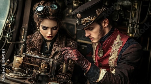 Fototapeta premium A steampunk styled couple working on complex machinery together closely