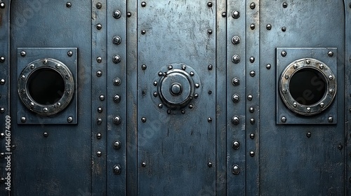 Fototapeta premium a steel door with portholes and rivets, resembling a submarine or bunker...