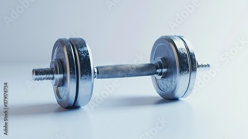 © Suphawan, Naklejka premium A steel dumbbell resting on a pure white surface, the shine and details of the metal stand out against the clean backdrop.