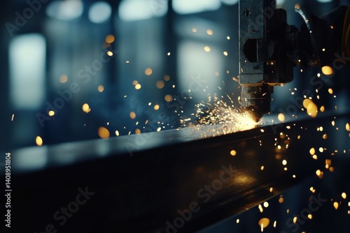 © Mcgui, Fototapeta premium A steel fabricator cutting beams at a metalworking shop. Featuring craftsmanship and industrial precision