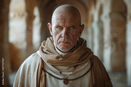 Naklejka premium A stern medieval monk with a shaved head and wearing a beige robe, stands in...