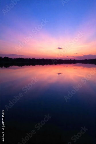 Fototapeta premium A still, calm body of water reflecting a serene sunrise or sunset,...