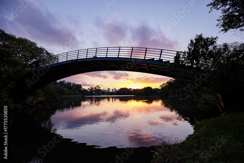Naklejka premium A still image of the iron bridge over the lake in Ibirapuera Park, Sao Paulo, with the sunset.