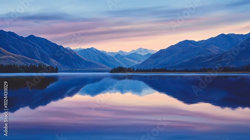 © Rstm, Fototapeta premium A still lake reflects a colorful sunset over a mountain range.