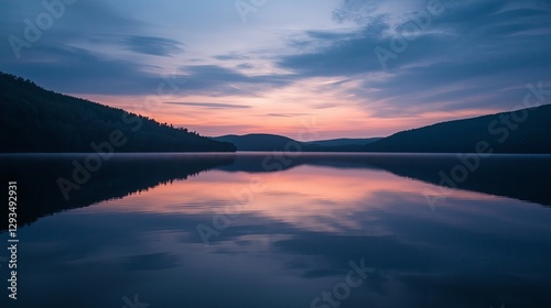 Fototapeta premium A still lake with a perfectly mirrored sky at twilight