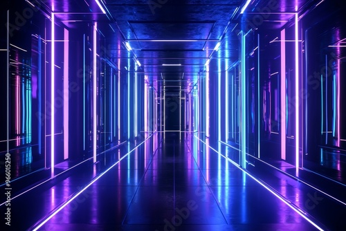 Fototapeta premium A stock illustration of a futuristic corridor with purple and blue neon lights in an abstract background