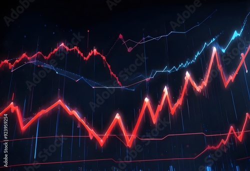 © Kdhtdg, Naklejka premium A stock market chart with candlestick patterns and technical indicators displayed on a dark background with neon-colored lines and lights