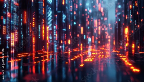 © Phata, Naklejka premium A stock market trading floor with glowing holographic financial charts and neon-lit data streams, Cyberpunk, 3D Render, Cool tones