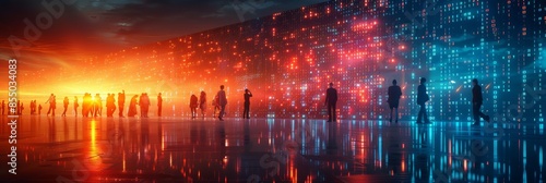 © JIALU, Fototapeta premium A stock market wall displaying digital numbers and figures with business people walking in the background, representing global financial trading and currency exchange at night. High-resolution