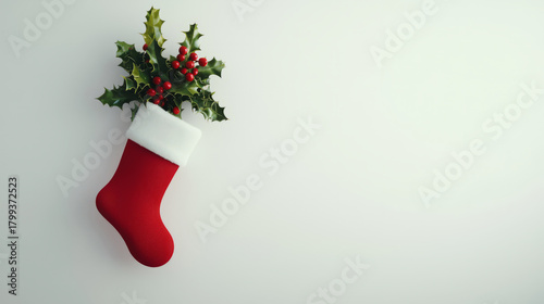 © Лилия Захарчук, Obraz premium A stocking hanging on a blank wall with a small sprig of holly for a festive, New Year's look.