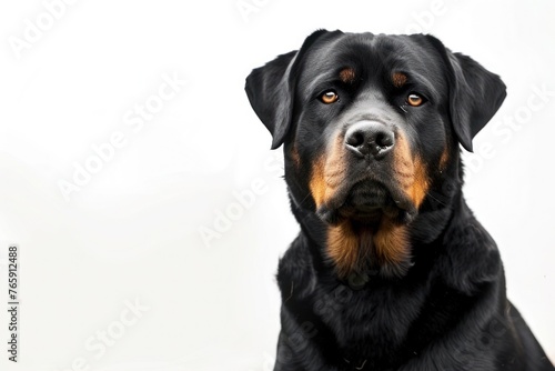 © Anna, Fototapeta premium A stoic Rottweiler posing for the camera, with a blank area on the bottom left corner, perfect for adding text.