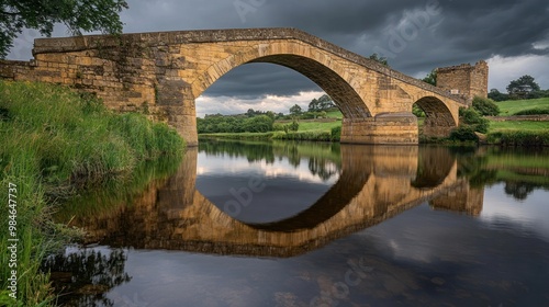 © BerkahStock, Fototapeta premium A stone arch bridge reflected in calm water under a dramatic sky.