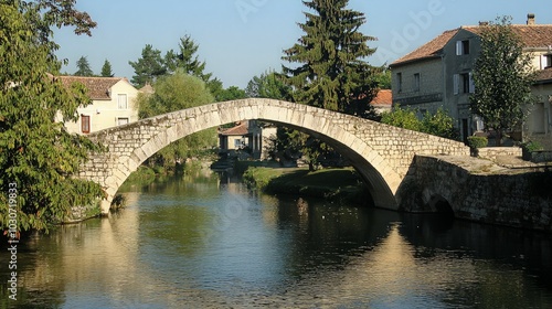 Naklejka premium A stone arch bridge spans a calm river, with lush greenery and quaint houses...