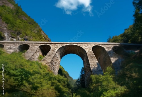 Fototapeta premium A stone arch bridge spans a valley, framed by green trees and a bright blue...
