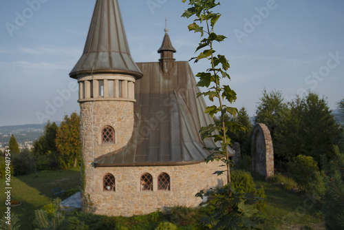 © Svetlana, Naklejka premium a stone church with a tall steeple and a clock on it. The church has a sloped roof and is situated on a grassy hill.