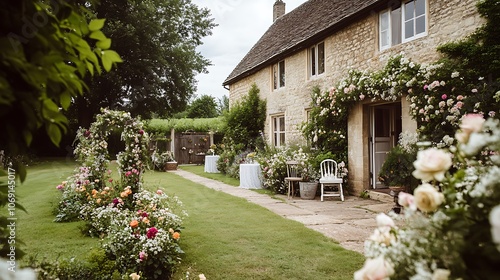 © Tcukimay, Fototapeta premium A stone house with a pathway leading to the front door. The pathway is lined with flowers and greenery. The house is covered in flowers and greenery, with a wooden door leading to the house.