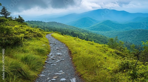 © Ariestia, Obraz premium A Stone Path Winding Through Green Mountain Ridges