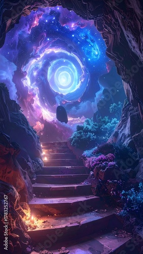Fototapeta premium A stone stairway leads toward a mystical cosmic portal within a cave, adorned...