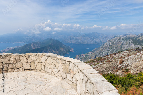 © evannovostro, Fototapeta premium A stone terrace offers a panoramic view of rugged mountains, a deep blue sea