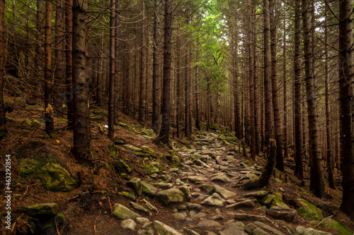 Naklejka premium A stone trail in the pine forest, Carpathian mountains, Ukraine