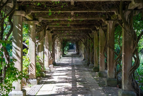© Anastasiia, Obraz premium A stone walkway lined with a pergola covered in vines leads into a garden.