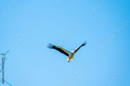 Fototapeta premium A stork flies far past the sky with a blue background