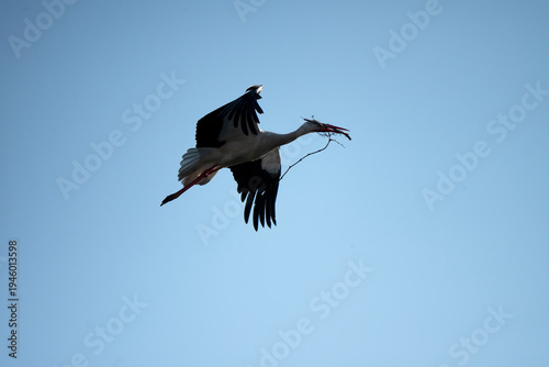 Naklejka premium A stork flying, carrying branches in its beak to the nest